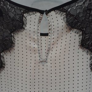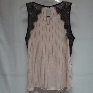 Black lace and champagne, sleeveless blouse. Round black-trimmed neck. 100% polyester. Black lace on armhole denotes a touch of elegance.