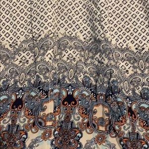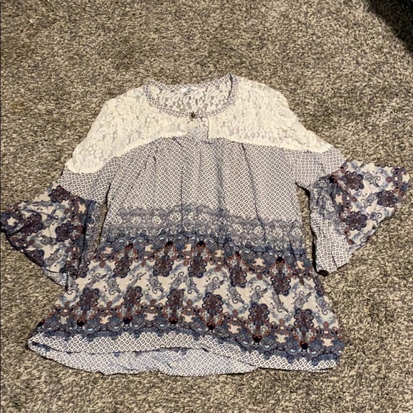 Cute blouse. Rayon contrast, cotton and Nylon material. Has ruffle type sleeve. Very comfy