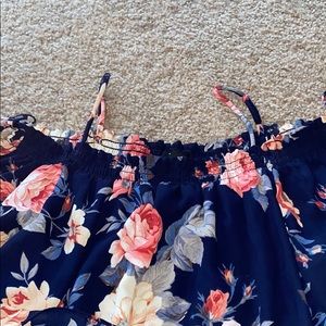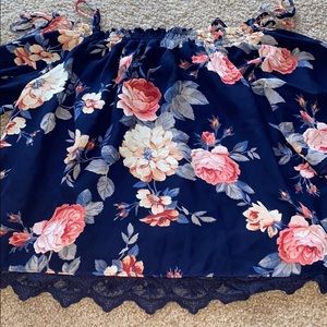 Off the shoulder/cold shoulder (you could tuck the straps in) floral blouse. Has a second layer underneath that’s soft with cute lace on the bottom. Slight fraying on the tie part (located on shoulders- see pic)