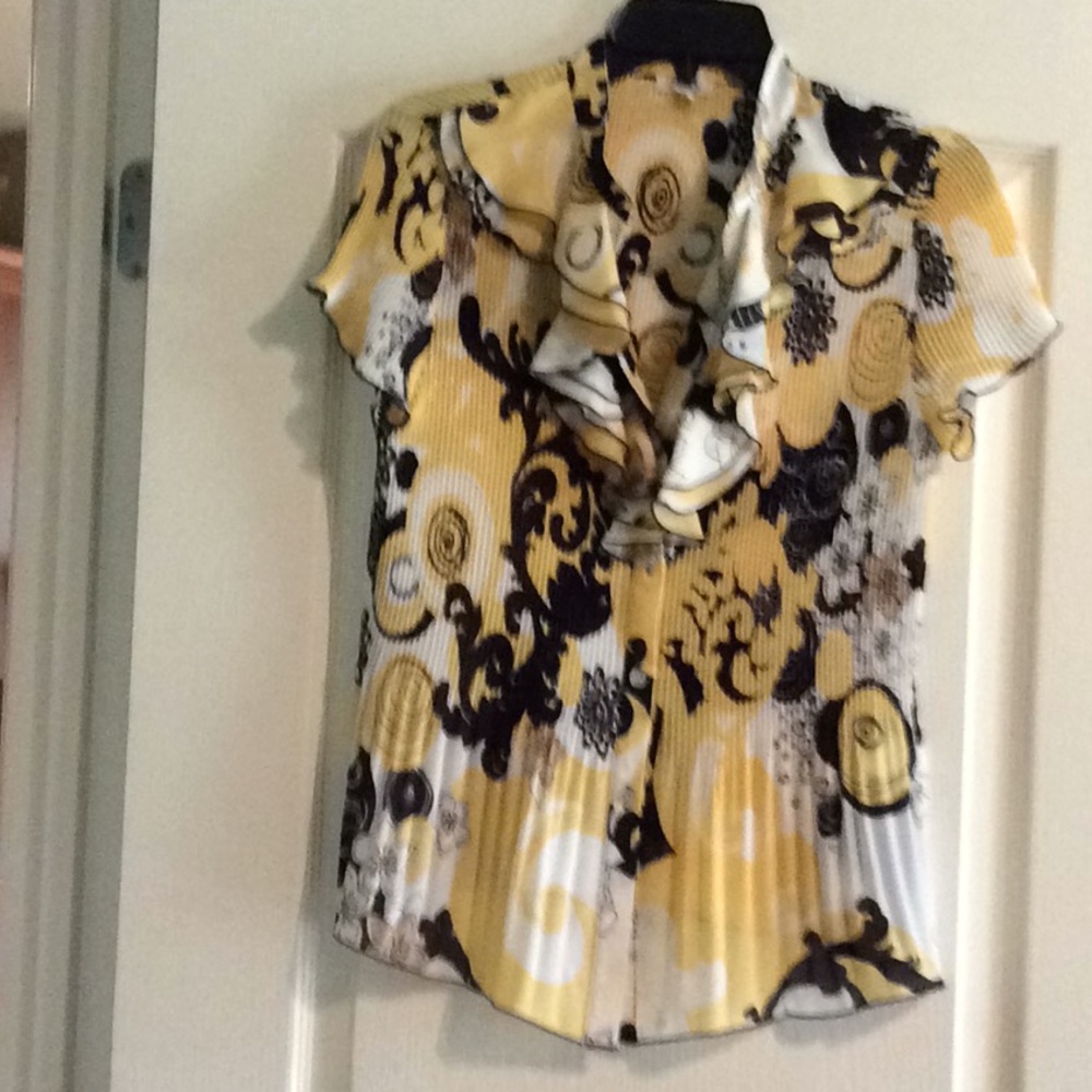 Short sleeve button down blouse. Vertically pleated. Ruffled at neckline and on seams of sleeves.