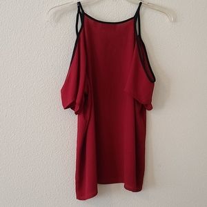 Red blouse, Black criss cross front, open shoulder/can lay off shoulder short sleeves. Light and airy material. Worn once in London. Great date night top!