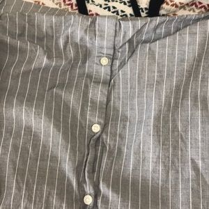 Off the shoulder grey with white stripes blouse. The sleeves are adjustable and can be tightened at the end of sleeve.