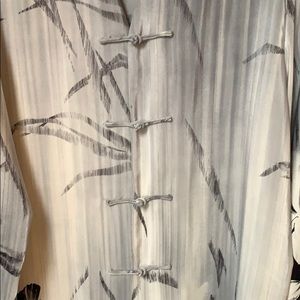 Elegant Asian Tunic length blouse in 100% silk. All hand knotted buttons intact. Extraordinary hibiscus, orchid and bamboo design.