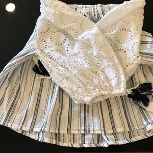 Really really cute top. The sleeves are white and the body is white with a stripe. This stripe color is strange because depending on the light it could navy or lite charcole