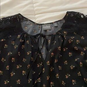 Black and floral blouse never worn. Front tie with lace on the shoulders. From a smoke-free home.