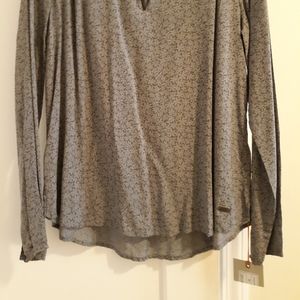 Floral print blouse has banded collar and V-neckline. Long sleeves with decorative button cuffs and loop closure. 100% Modal. Fits XS/S.