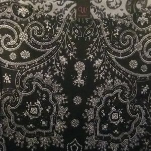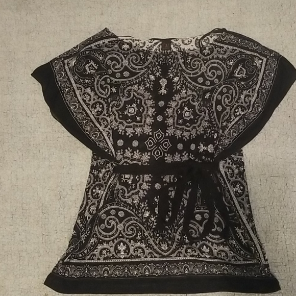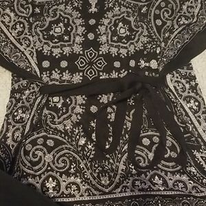 Black and white, paisley pattern, black tie at waist, short sleeve, flowy, cotton