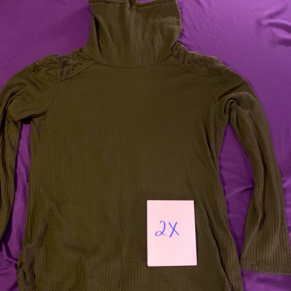 Olive green blouse with lace shoulders and a loose turtle neck. Long sleeve.