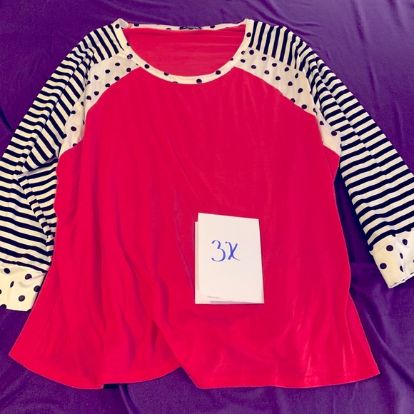 Pink blouse with black and white quarter length sleeves. Very fun shirt.
