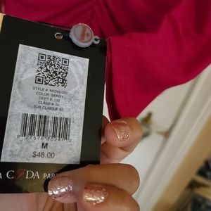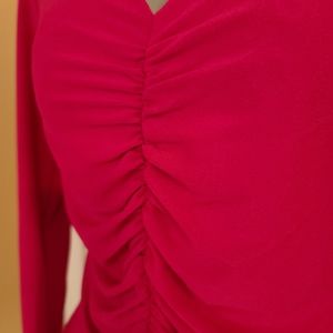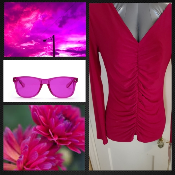 Beautiful dark fushia blouse with ruching in the front, long sleeves, form fitting but stretchy. Gorgeous!