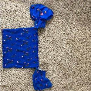 Over the shoulder, floral blue crop top. Material is so stretchable and isn’t an itchy material either. Never warn the blouse