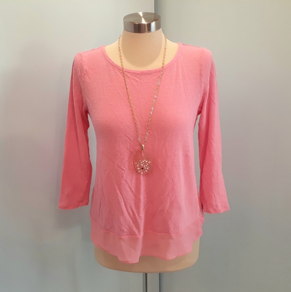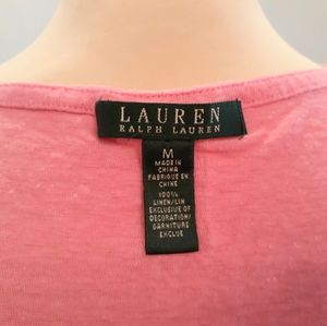LAUREN RALPH LAUREN. Previously. Great condition. Medium. Pink rose. Pullover. Sheer bottom hem. Soft fabric. 3/4 sleeves. Relax fit. Stretch. 100% linen. No swap. Pet/smoke free. Ship today or tomorrow.