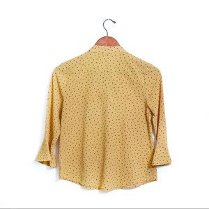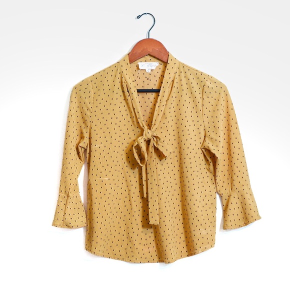 Rich Golden Sweet Wanderer Blouse with fun polka dotted pattern! This Chiffon blouse has belled sleeves and a bow tie embellishment. Works for casual or can be dressed up!
