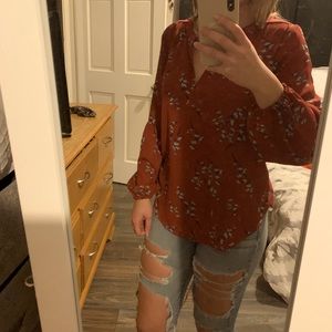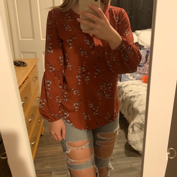 Nice blouse. Dark rusty orange with blue and white flowers. Good material.