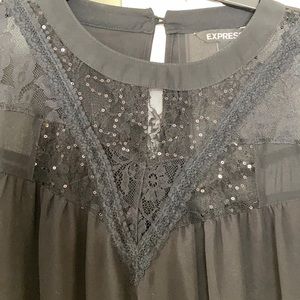 Black blouse shirt. Button at the top in back. Lace and bead work on the front. The top flows from neck down.