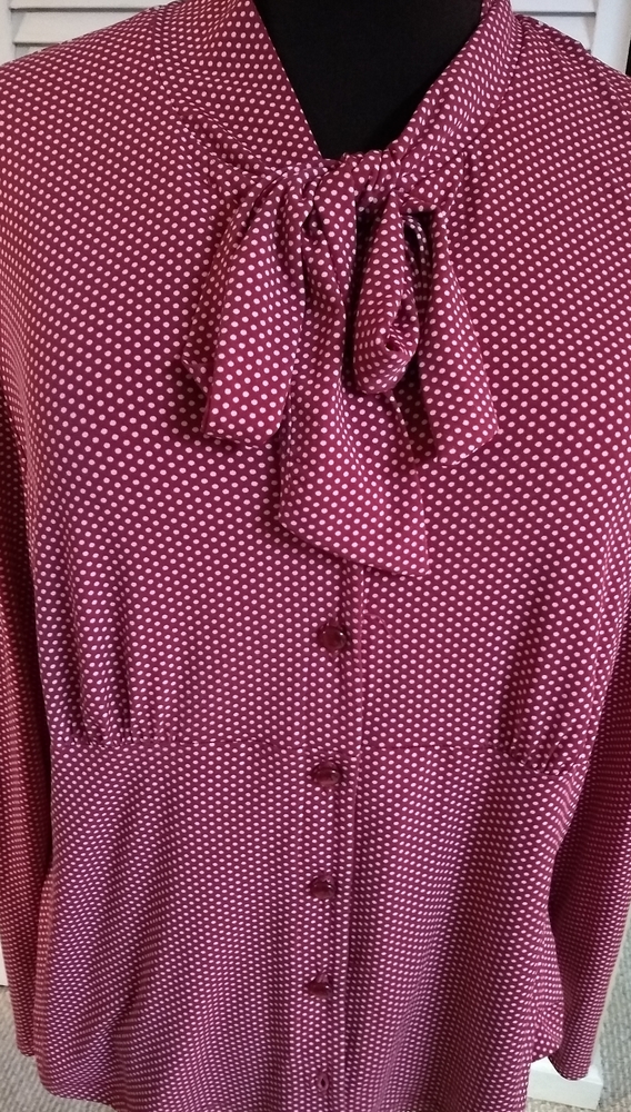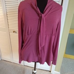 Beautiful soft knit blouse with tie at the neck that can be tied multiple ways. Can dress it up or down with a pair of jeans or shorts. Would really look great with a pair of white pants. Top is red with tiny white polka dots. Excellent condition, sz XL