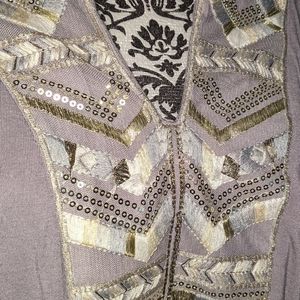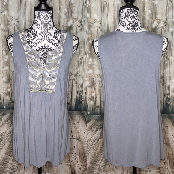 Blue grayish color, tribal sequin design, v neck sleeveless top. Super flattering, very soft material. Worn but NO holes, stains or tears! Like brand 🆕