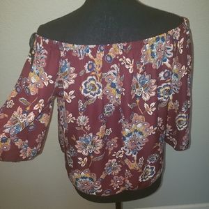 Burgandy florsl off the shoulder blouse.