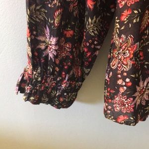 Lightweight floral print blouse with a tie at the neck. Slightly transparent (need a cami) with cinched cuffs and loose hemline. Hits at or right above the hips. Worn twice.