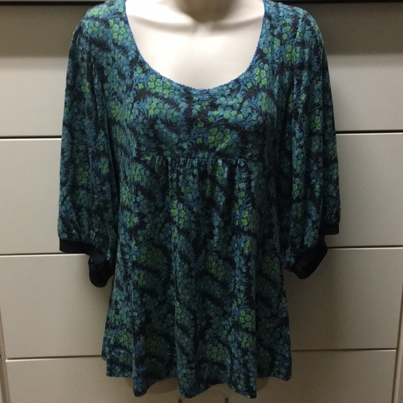 This blouse is blue lime green black it has blousy sleeves ties in the back and is size large, this top is light and airy perfect for summer