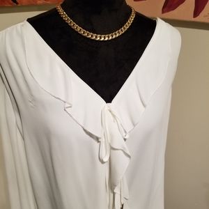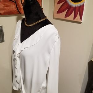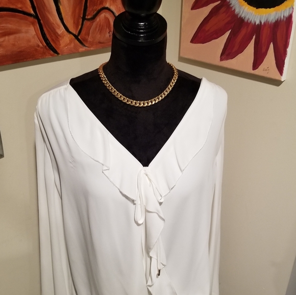 Off white opaque blouse with feminine neckline , soft bow with Gold accents .To be worn outside of pants or skirts .Buttoned wrists (Gold buttons).Small imperfection on right front of blouse. SEE PIC