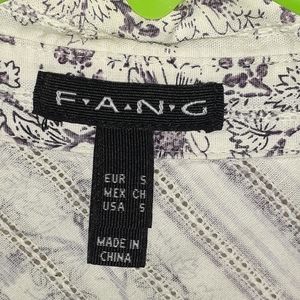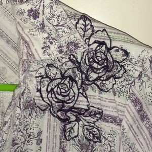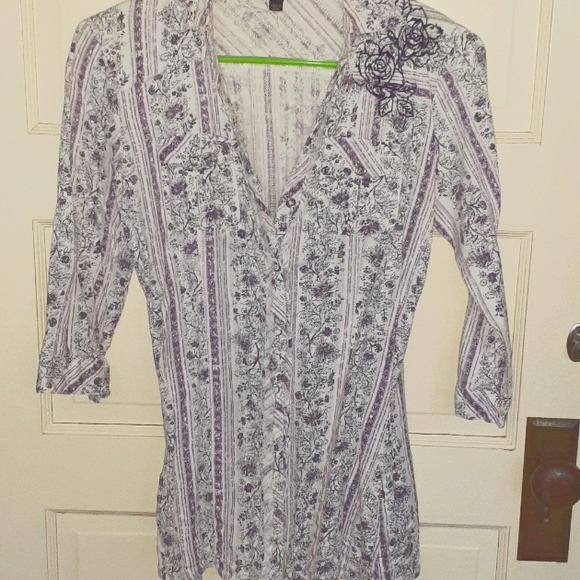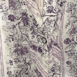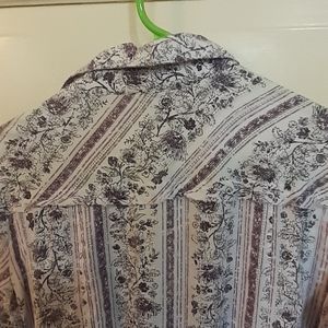 Fang, small, purple and lavender, flowers and stripes, snaps down front, on sleeves, and at sides, "frayed" trim across yoke and down the front along snaps. Casual "country meets bohemian" ?