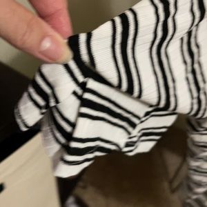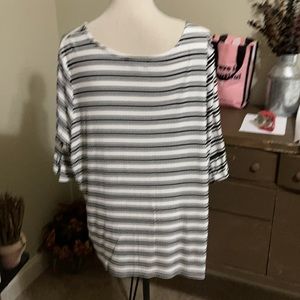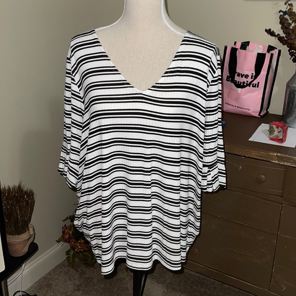 Ellos size 1x black and white v neck striped top with 3/4 length flutter sleeves. 33 inches in length 26 PTP at chest. Cotton spandex