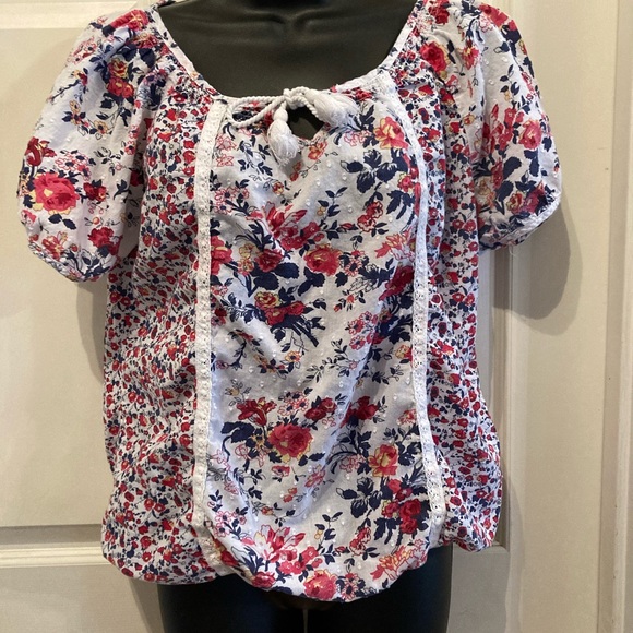 Red, white and blue floral print. Blouson with decorative rope tie. Very summer stylish with jeans or shirts. Excellent condition.