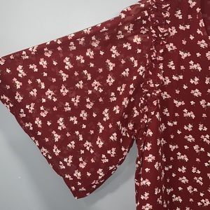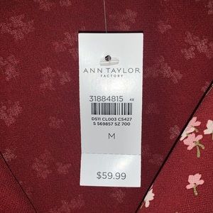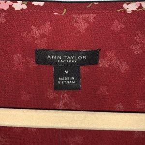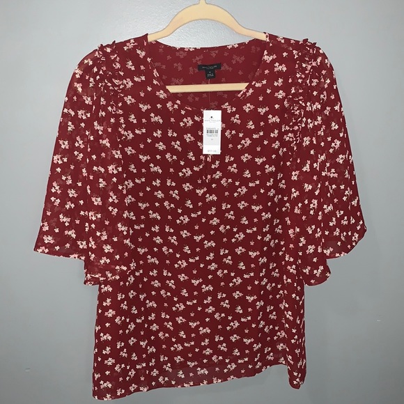 NWT Ann Taylor short sleeved blouse. Maroon color with floral pattern. Never worn, no damage! Has ruffle pattern around the top of each sleeve. The shirt has a solid maroon slip under it. Front of shirt has key whole design. Size M