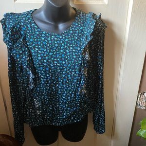 Beautiful black blue and green floral ruffle blouse with long sleeves with elastic at the wrist and waist with one button in the back