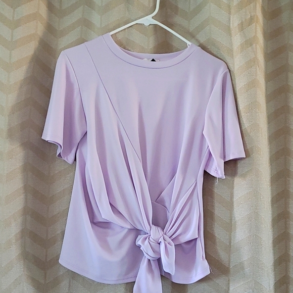 Light purple blouse, perfect for Church, or office attire. Cute tie on the side.