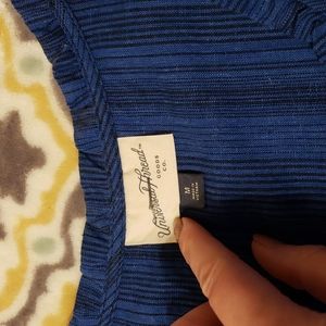 Blue with black pinstripes. Missing 4buttons, allowing you to add your own style or wear open with a tank underneath.