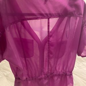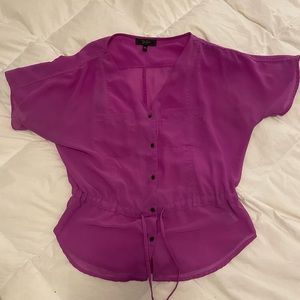 Purple blouse. Short sleeved with ties in the front to make adjustable along with buttons. Great condition. Great for work or going out. Lightweight and comfortable. See through so need a tank or something underneath.
