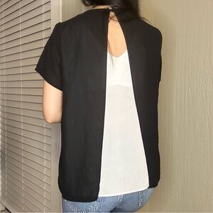 Super cute blouse for work or a date! A white v neck with a black shear to cover the shoulders