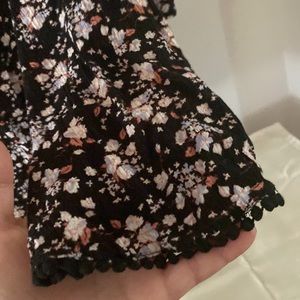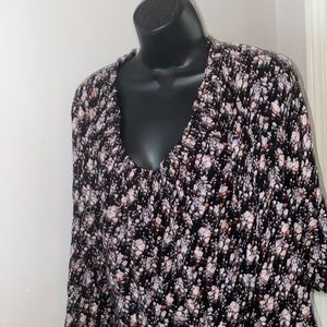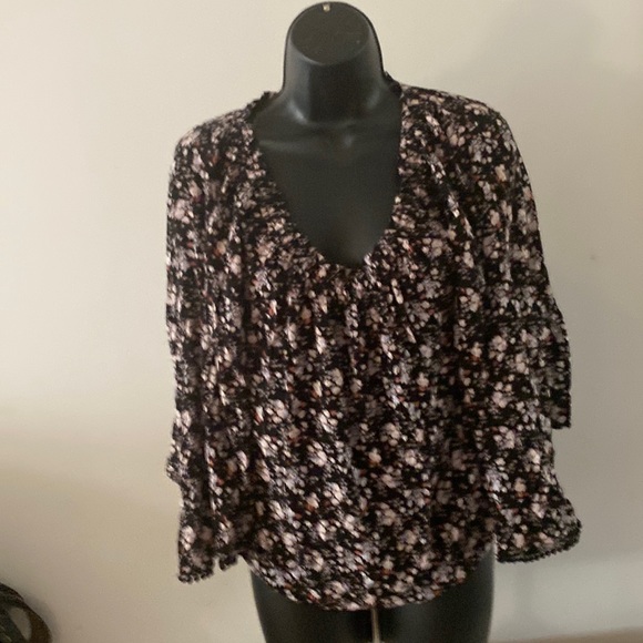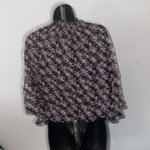 Flower print top elastic neckline bell sleeves v neck black with white and pink roses size m/l