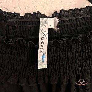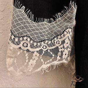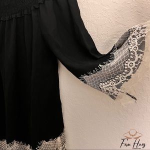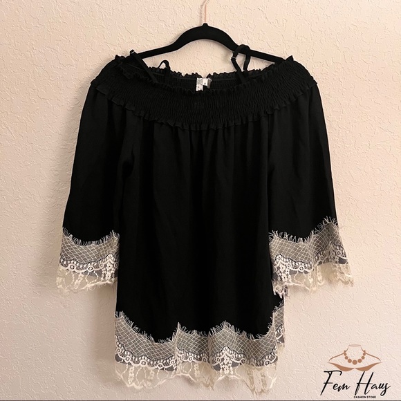 Off the shoulder blouse with straps Sheer blouse so I recommend wearing a tank top underneath Black with white lace detailing Gently worn
