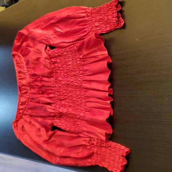 100% polyester red blouse with fitted cuffs and corset looking waist. womens size large