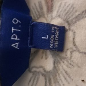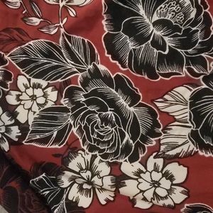 size large apt 9 blouse, maroon background with black and white floral pattern, banded waist and 3/4 length roused sleeves