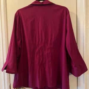 Fred Davis woman red blouse, size 2X, 3/4 Length sleeves, Button down blouse with v neck collar, front and back darts for a fit look, Material has some stretch. 74% polyester, 22% nylon, 4% spandex.
