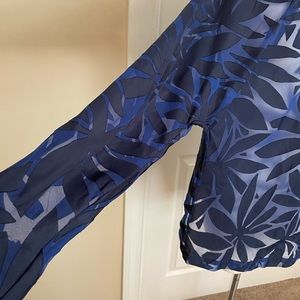 Sheer leaf print long sleeve blouse with tucked neck details.