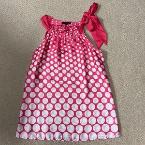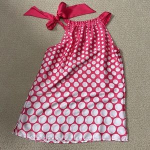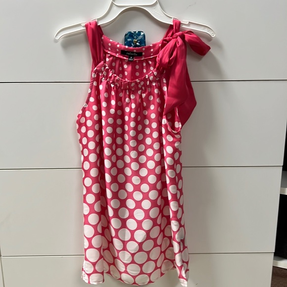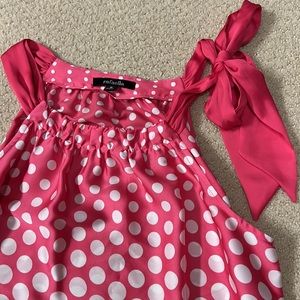 Pink and white polka-dot blouse. Silky lightweight material. Ties at the shoulder.