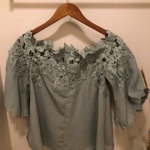 Sage green off the shoulders top can even be worn as a crop top. It is very loose fitting and comfortable but also very dressy . Perfect condition