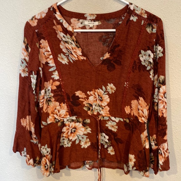 Rust and peach floral top with drawstring waist