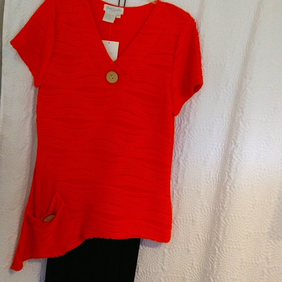 light weight poly top assimetrical design wrinkle free with one button in the front and one in the pocket one medium and one xl large left