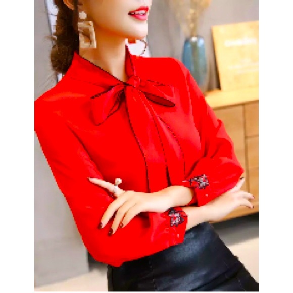 Red Chiffon Long Sleeve Blouse With Black Trim & Embroidered Detail. Worn Once. XXL (china size) Fits like US Large