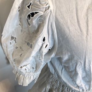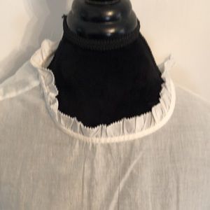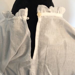 White blouse gathered at waist. Cape detailed sleeves. High neck with one small button in the back. Made in India.