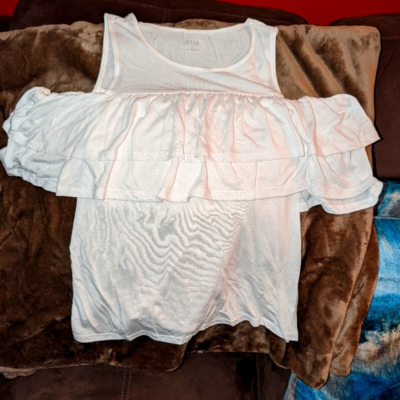 White cotton top sleeveless and arm inserts where top flares out at top (cold shoulder top)