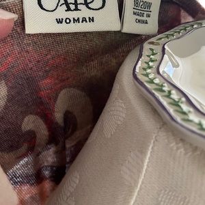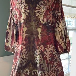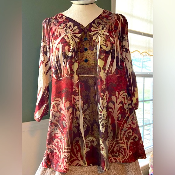 Multicolor blouse, browns, tans, reds and rusts. Three-quarter inch sleeves.