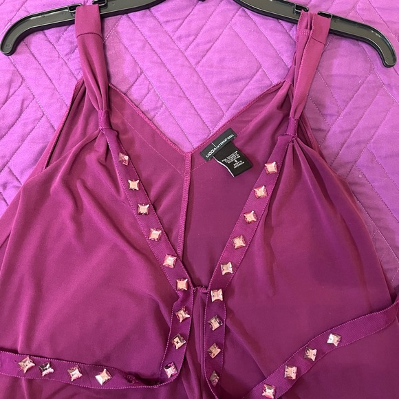Purple tank top blouse. Beautiful detailing. Says size small but fits like a medium or large. Straps tie at the bra line. Too big for me. Very good condition.