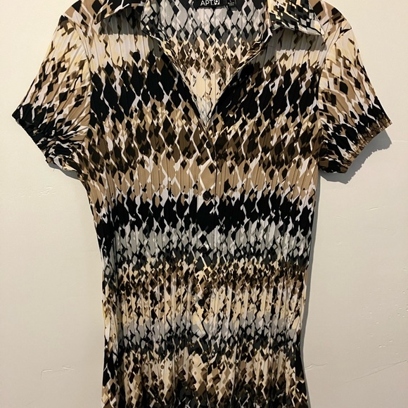 Never been worn multi colored print button down blouse with stretch pleats throughout. Skirted flounce detailing all around from hips to hemline.